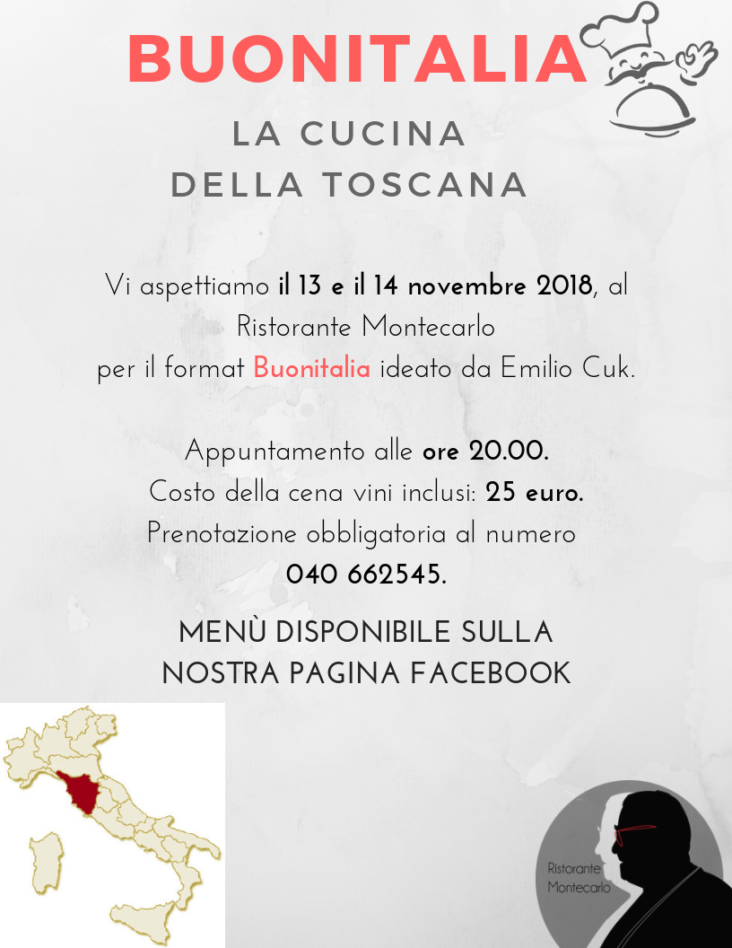 Il prossimo evento targato Buonitalia sarà martedì 13 e mercoledì 14 novembre 2018 e riguarderà la cucina della toscana. Prenotazione al numero 040 662545.